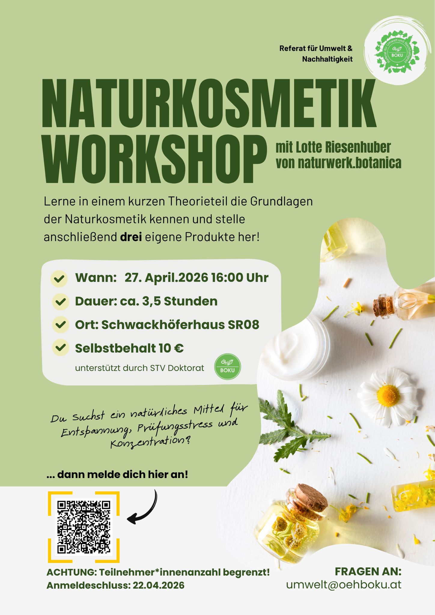 Lerne gemeinsam mit Lotte Riesenhuber von naturwerk.botanica die Grundlagen der Naturkosmetik kennen! In einem kurzen Theorieteil erhältst du spannende Einblicke in natürliche Inhaltsstoffe und deren Wirkung. Anschließend wirst du selbst kreativ und stellst drei eigene Naturkosmetik-Produkte her, die du mit nach Hause nehmen kannst.